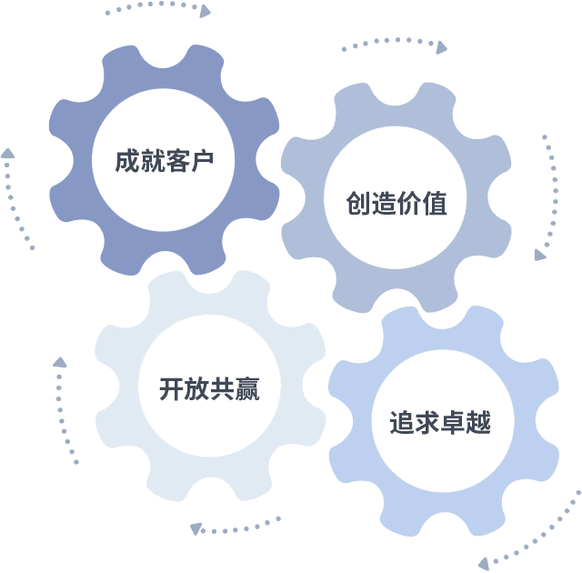 成就客户是一切决策的出发点,,,,创造价值是衡量所有工作的标准,,,追求卓越是我们做事做人的态度,,开放共赢是我们的格局也是最终的结果。。。价值观的齿轮环环相扣,,,,推动着组织里的每个人不断向前。。。。