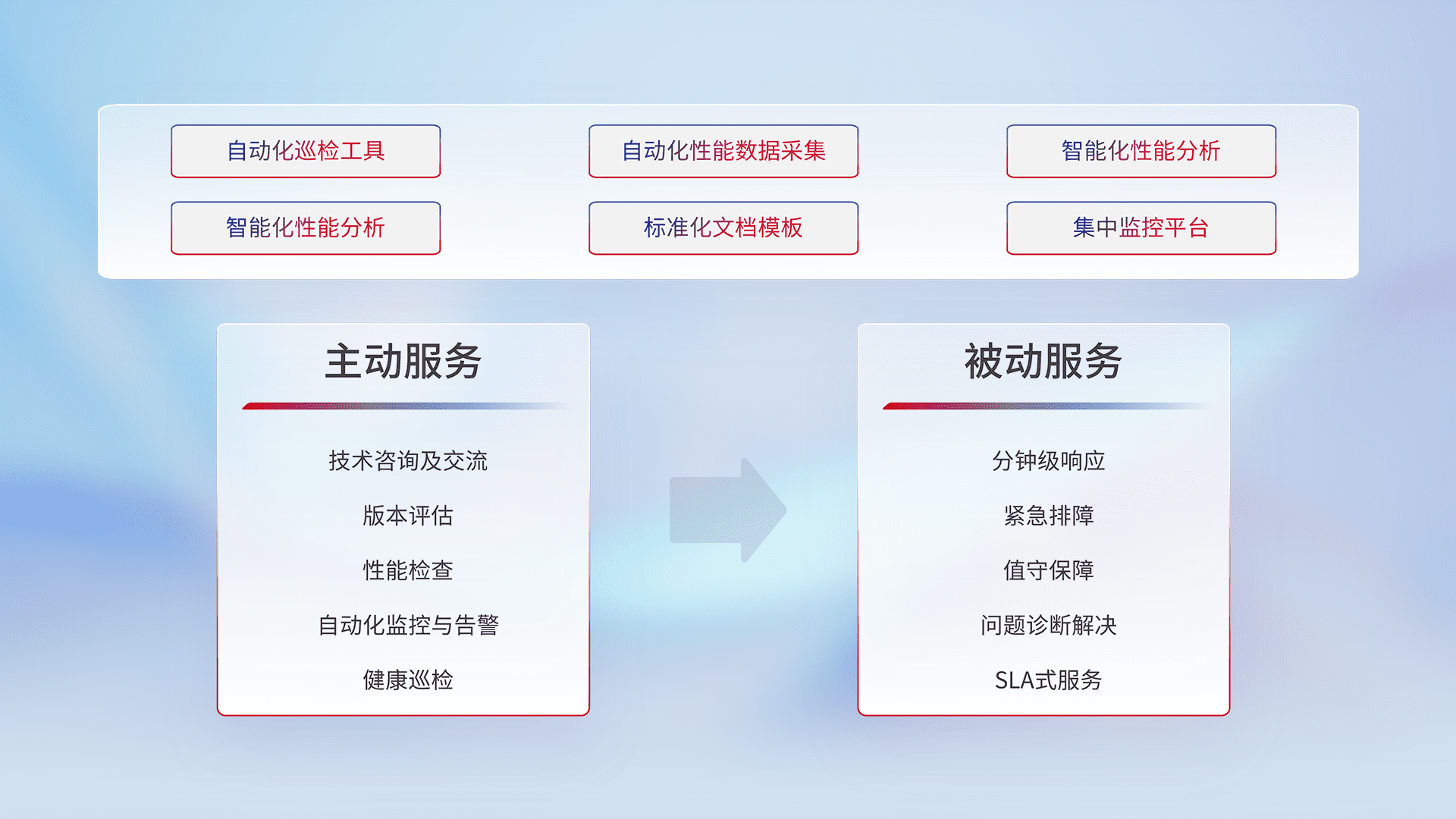 智能化工具和标准化文档,,,保障服务质量,,,,提供主动服务(包含技术咨询、、版本评估、、、性能检查、、、自动化监控与告警、、健康巡检)和被动服务包含(分钟级响应、、、、紧急排障、、、、值守保障、、、问题诊断解决、、SLA服务)。。